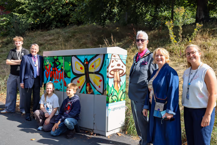 On 21 August 2025, two young artists, Josie and Finley, the Heathfield Youth Hub team, Ed and Leesha, Tracy Hobden and Rob Reaks, were joined by Councillor Roy Galley, Chairman of East Sussex County Council, and Councillor Gavin Blake-Coggins, Chair of Wealden Council, to unveil the decorated Lightning Fibre cabinet.